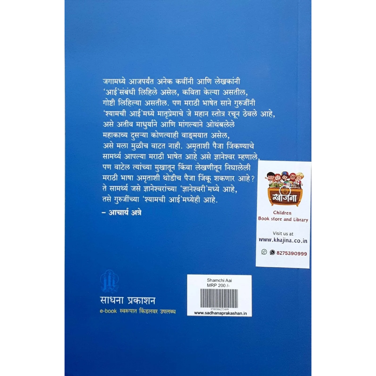 Previous Product Next Product श्यामची आई₹200.001 in stock श्यामची आई quantity Add to cart Categories: AGE 14 AND ABOVE, मराठी पुस्तके Description Reviews (0) Descriptionलेखक:- साने गुरुजीPAGES:-212SIZE:-Share the book ReviewsThere are no reviews yet. Be the first to review “श्यामची आई” Cancel replyYour email address will not be published. Required fields are marked *Your rating *Rate…PerfectGoodAverageNot that badVery poor Your review *Name *Email * Save my name, email, and website in this browser for the next time I comment. Related products Quick View Quick Viewकुठं? ₹120.00Add to cart Quick View Quick Viewआपली सूर्यमाला ₹180.00Add to cart Quick View Quick Viewधूमकेतू ₹90.00Add to cart
